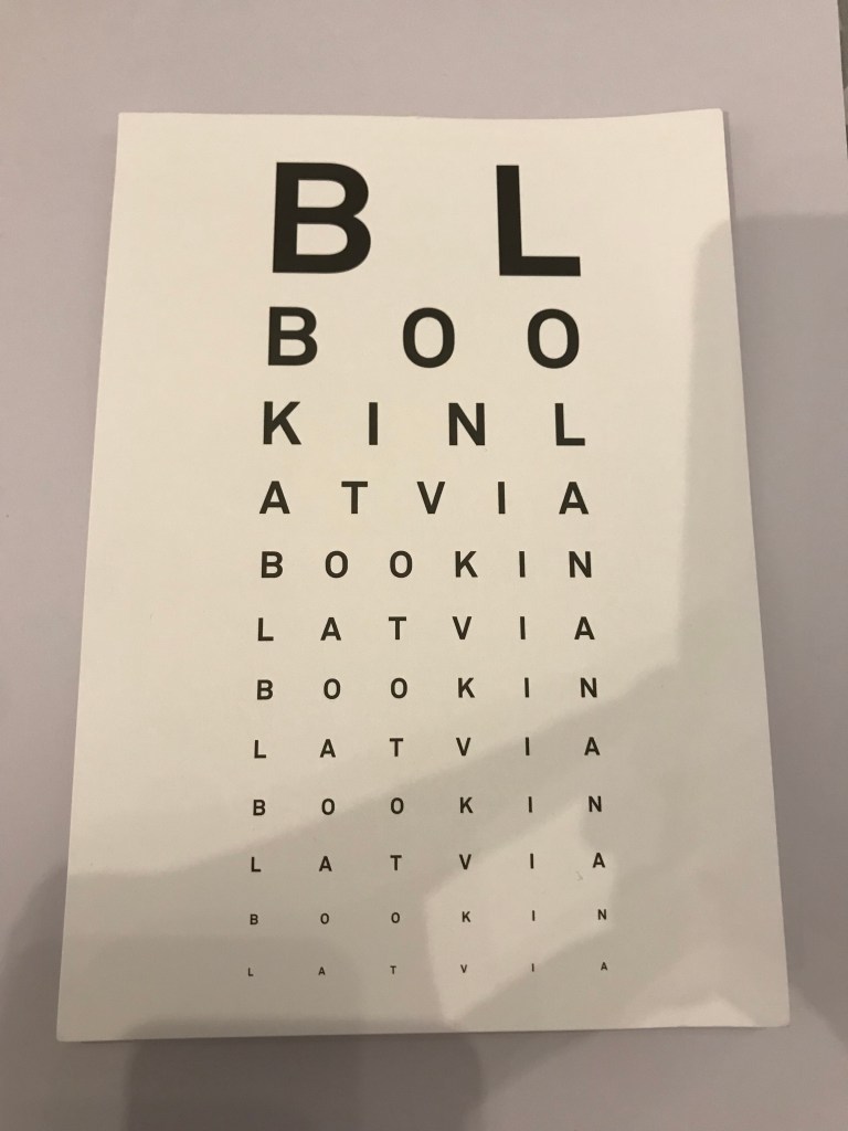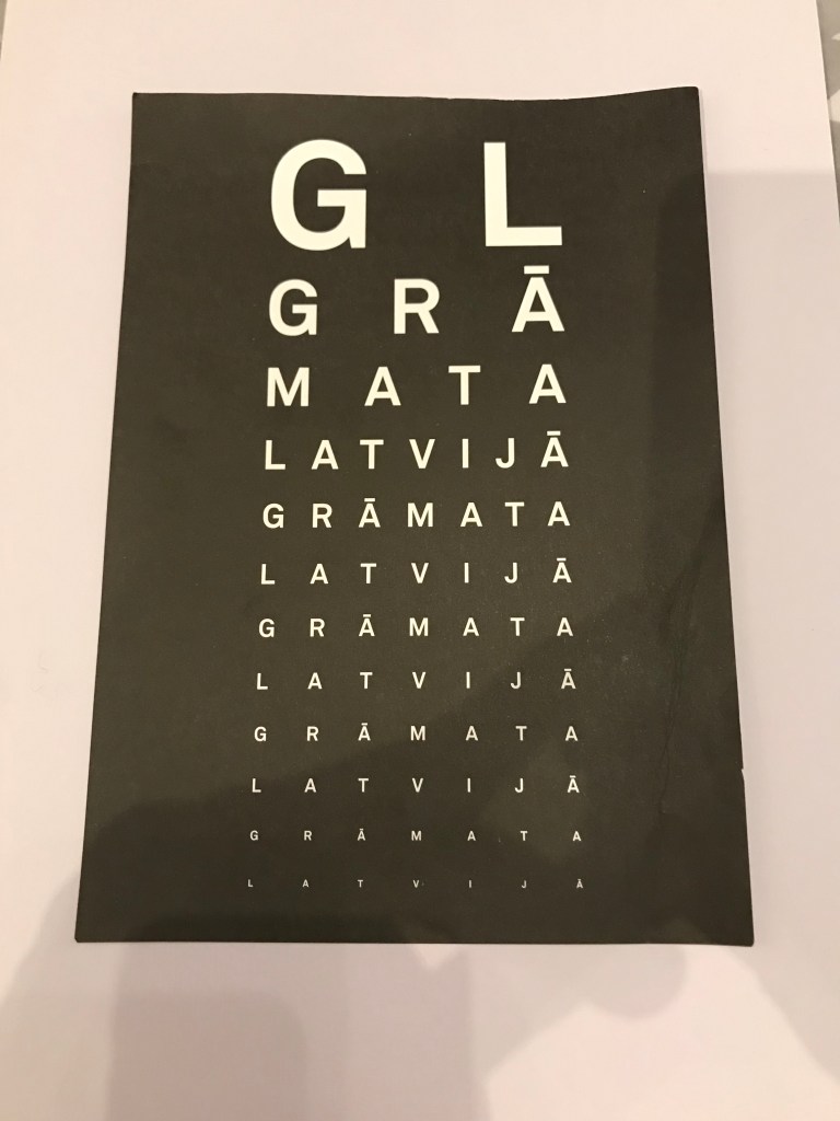 In stark contrast to the above, is an A5 two-sided leaflet I picked up on a recent trip to Riga in Latvia. The leaflet was advertising and contextualising a small exhibition being held in the National Library there. The front of the leaflet is what initially caught my eye. A very simple design, using an optician’s eye chart as inspiration, the exhibition entitled ‘Gramata Latvija’ (or ‘Book in Latvia’) is repeated on the front, getting smaller towards the base of the page. Not immediately easy to ascertain what is being portrayed, it enables the reader to delve further, which is when you turn overleaf and are greeted with a very clean three column layout in which the exhibition is explained in full. As stated I chose this piece, as I not only liked the style in which it was being presented, but also that it is in stark contrast to the poster above. Two very different examples of how type can work as the focal point or alternatively, with the focal point to good effect.