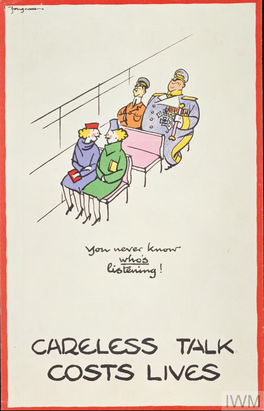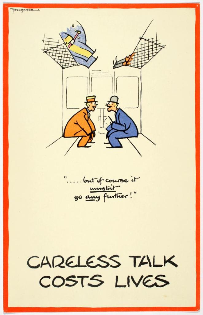 Other very similar campaigns existed throughout the Allied and Axis nations during the conflict – another example being the British take on the same message. “Careless Talk Costs Lives”. Again, short and to the point as it aims to get the message across to people quickly. But unlike the American version, the series designed by Fougasse are slightly humorous and tongue in cheek which would most likely resonate better with the British public. They depict two members of the public chatting to each other, seemingly unaware of would may be listening in. In all of the posters however, background objects or people are made out to be caricatures of Hitler, or his upper echelon staff such as Goering etc, to show who may be listening in. Humour isn’t a strategy one would expect with propaganda or campaign style posters, but is something that I think works particularly well here and shows a great understanding of the target audience.